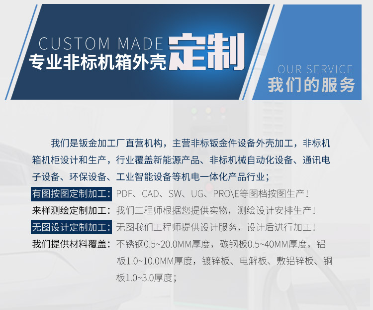 金美特機(jī)械制造是鈑金加工廠直營(yíng)機(jī)構(gòu),主營(yíng)非標(biāo)鈑金件設(shè)備外殼加工,非標(biāo)機(jī)箱機(jī)柜設(shè)計(jì)和生產(chǎn),行業(yè)覆蓋新能源產(chǎn)品、非標(biāo)機(jī)械自動(dòng)化設(shè)備、通訊電子設(shè)備、環(huán)保設(shè)備、工業(yè)智能設(shè)備等機(jī)電一體化產(chǎn)品行業(yè);